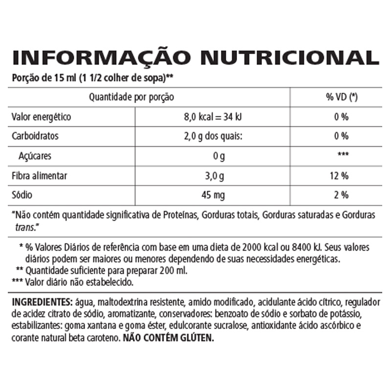 Cada porção fornece 3g de fibra solúvel, elaborada a partir da fibra de milho, e contém apenas 6 kcal, sem adição de açúcares.