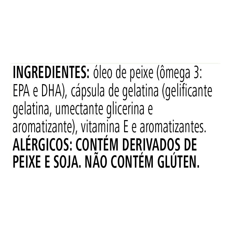 Óleo de peixe (Ômega 3: EPA e DHA), cápsula de gelatina (gelificante gelatina, umectante glicerina e aromatizante), vitamina E e aromatizantes naturais.