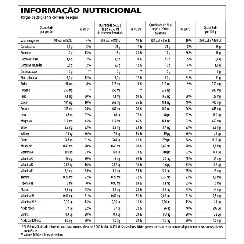 Misture 2 ½ colheres (26g) com 250ml de leite semidesnatado ou NutreV. Você pode ainda adicionar frutas, gelo ou proteína extra para personalizar e variar o preparo conforme sua preferência.