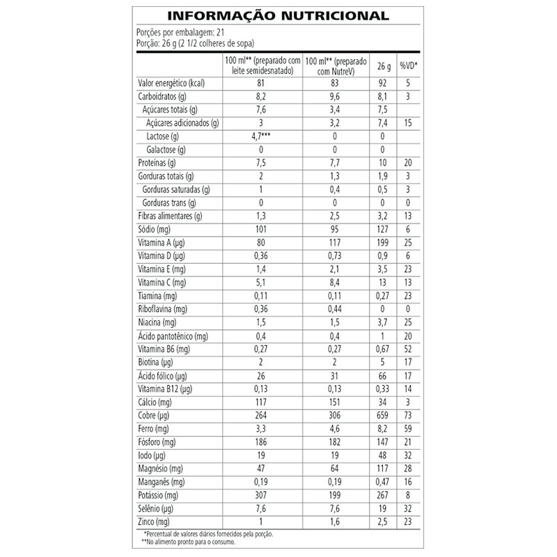 Misture 2 ½ colheres (26g) com 250ml de leite semidesnatado ou NutreV. Você pode ainda adicionar frutas, gelo ou proteína extra para personalizar e variar o preparo conforme sua preferência.